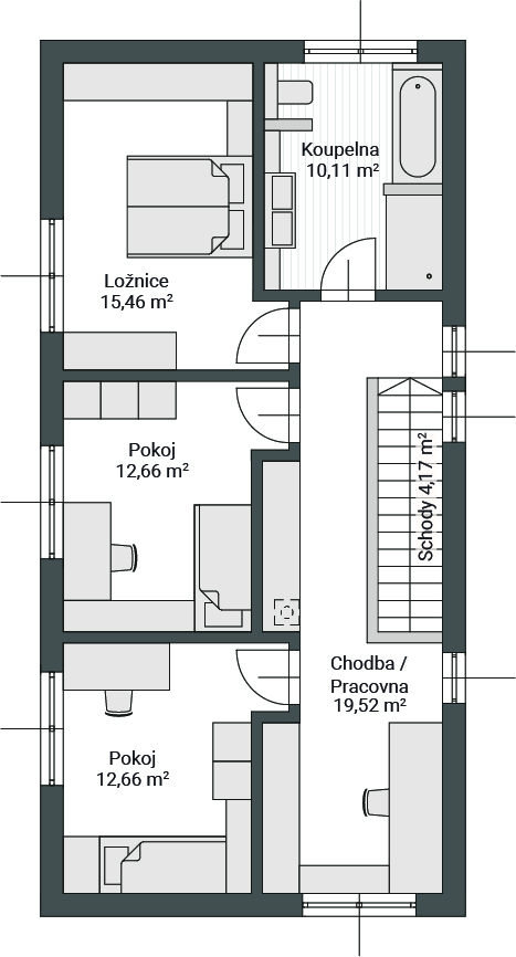 Sera 153 je největší z našich patrových domů. Nabízí velkorysý prostor pro rodinný život i vícegenerační soužití. Jeho nadčasový design a praktické řešení interiéru z něj dělají ideální volbu pro ty, kteří hledají bydlení kombinující moderní styl a maximální funkčnost.